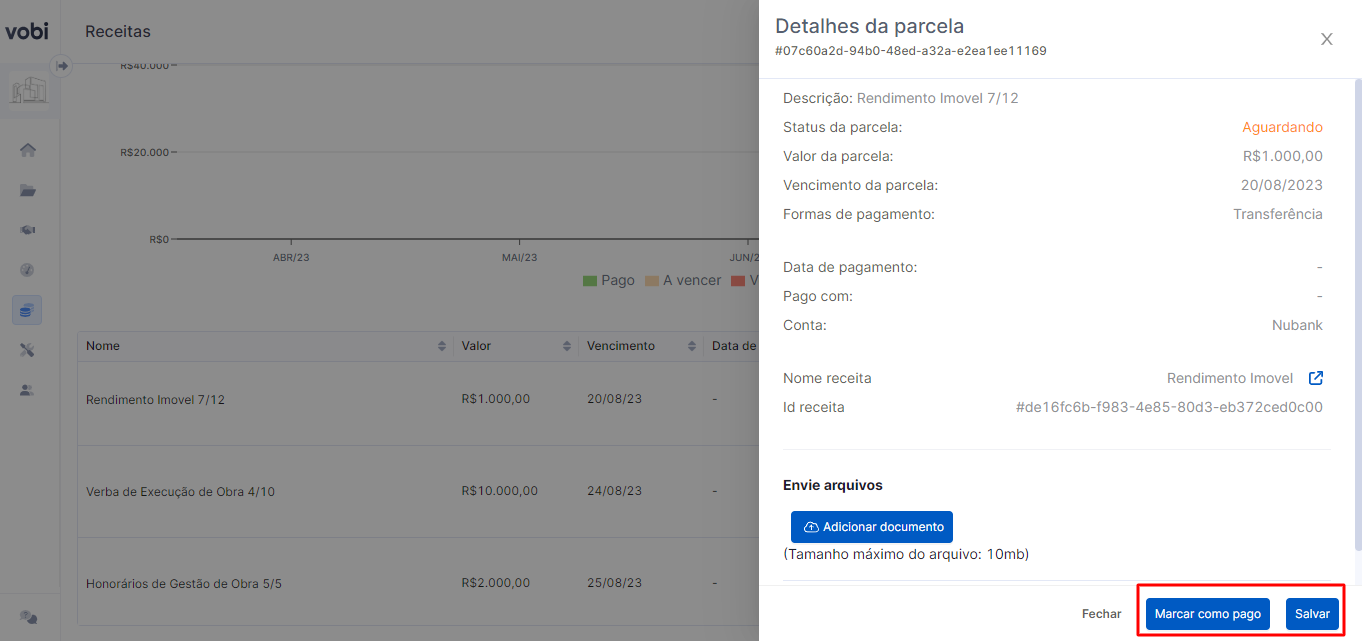 Caso queira alterar o status para "Pago", basta clicar nos três pontinhos e finalizar o registro de pagamento. Eventualmente você poderá também adicionar recibos e revisitar os detalhes desse lançamento, como indicado abaixo.