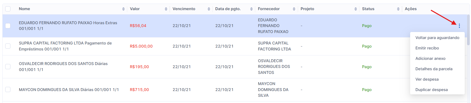 Além disso, pela lista de lançamentos, é possível acessar outras ações clicando nos três pontinhos ao lado de cada item.