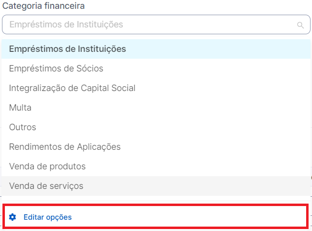 Categoria Financeira: pensando em facilitar o trabalho de vocês, deixamos uma lista de categorias já configuradas para seleção, além disso, você pode adicionar a sua própria categoria se desejar.
