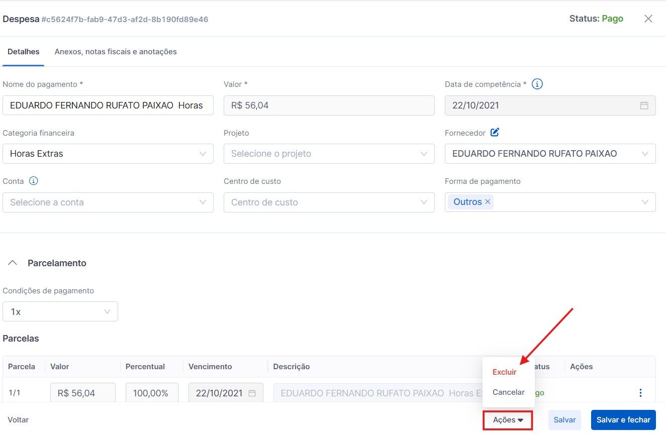 E caso queira excluir uma despesa, basta expandir as informações e pelo botão de ações, finalizar com Excluir - lembrando que essa ação é permanente.