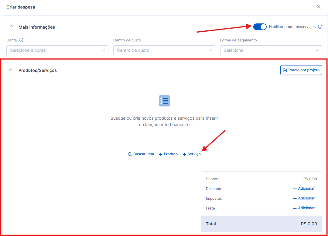 Ao ativar essa opção, os itens devem ser inseridos pelo botão '+' ou buscados diretamente do orçamento. Com isso, o campo de valor inicial da despesa é desativado, e o cálculo passa a ser feito com base nos valores dos itens adicionados.