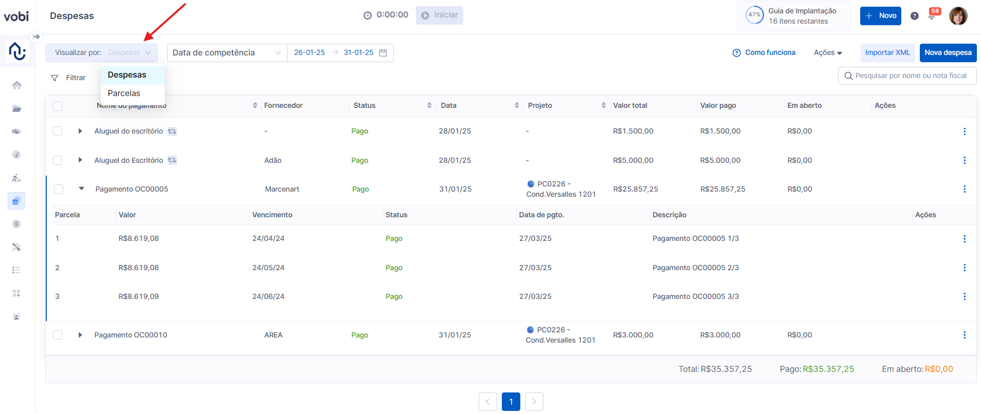 Configure se deseja ver as despesas de forma completa pela visão de "Despesas" ou pela visão de "Parcelas"