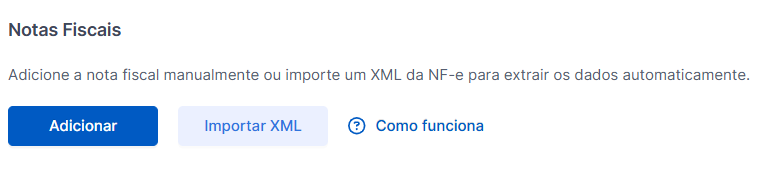 Adicione a nota fiscal manualmente pelo botão Adicionar ou importe um XML da NF-e para extrair os dados automaticamente.