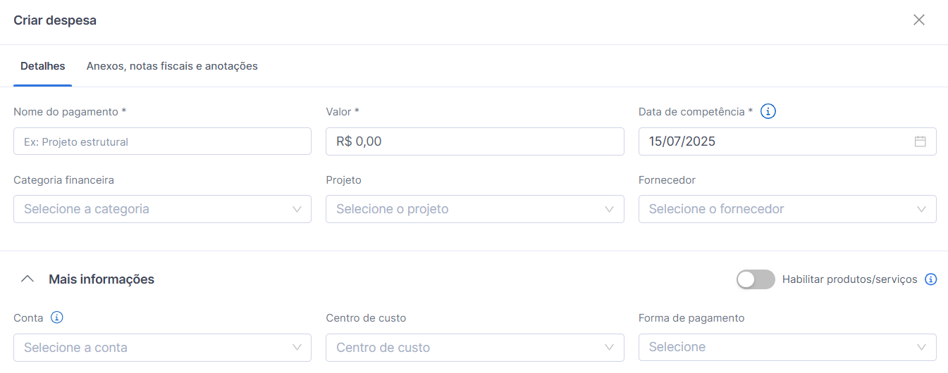 Para facilitar ainda mais esse processo, você poderá já vincular anexos a essa despesa, como documentos, comprovante de pagamento e outros.
