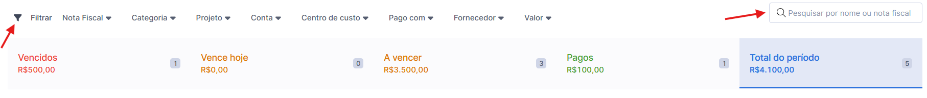 Utilize filtros para visualização personalizada - filtre por Nota fiscal (com ou sem) Categoria, Projeto, Conta, Centro de custo, Pago com, fornecedor ou valor.