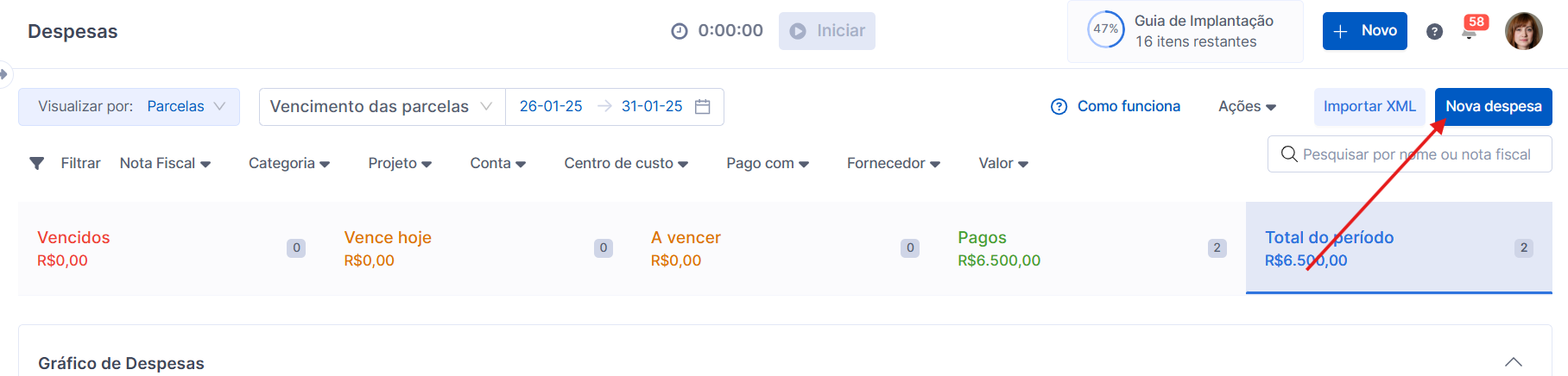 Clique no botão Nova despesa e preencha os dados a seguir para gerar a sua parcela no final.