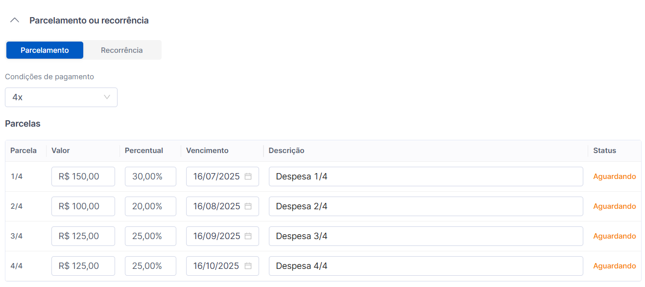 Por padrão, as parcelas possuem um intervalo de 30 dias corridos entre uma e outra, mas você poderá remanejar essas datas se necessário. Além disso, poderá também definir o percentual do valor total inserido que essa parcela se refere.