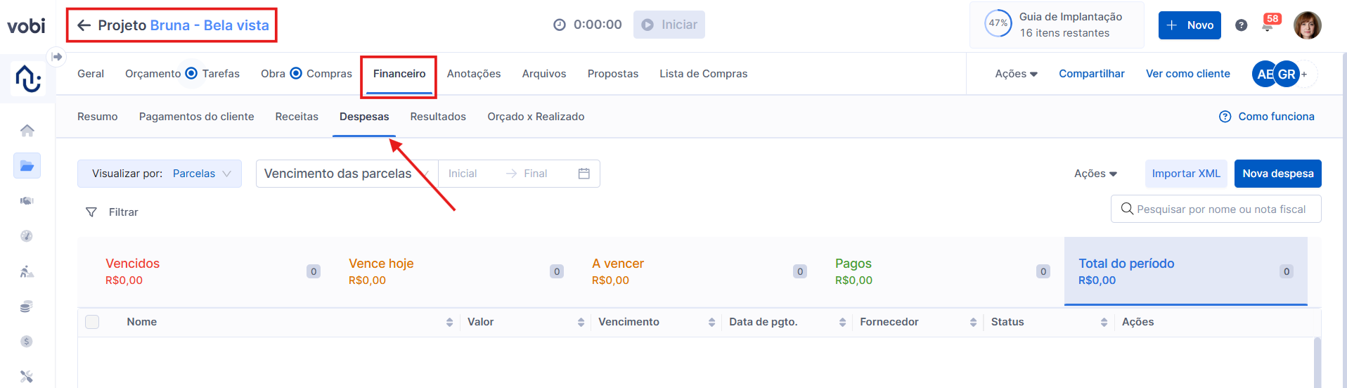 Projeto/oportunidade: aqui você pode vincular ou não essa despesa a um projeto já existente na plataforma Vobi;