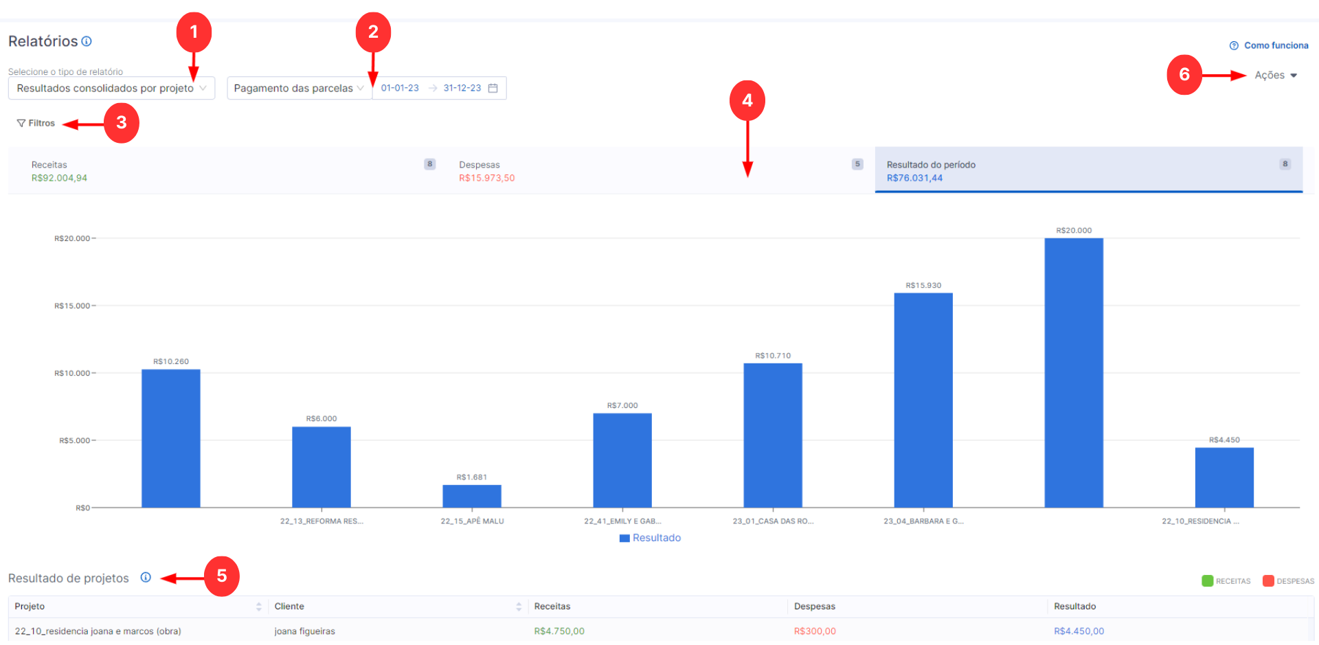 5. Resultado de projetos - depois do gráfico, é possível analisar os mesmos dados pela visualização de lista, e por aqui você tem a informação do cliente cadastrado em cada projeto e o resultado consolidado ou previsto - a depender da forma que o relatório for configurado.