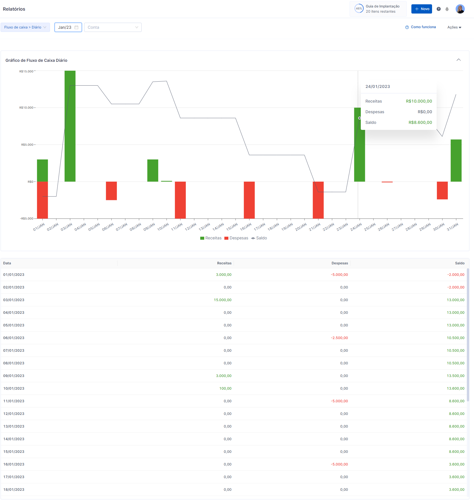 Fluxo de caixa diário - através desse relatório, você poderá acompanhar de forma detalhada o saldo previsto para cada dia e o volume de entradas e saídas, do seu negócio por dia.