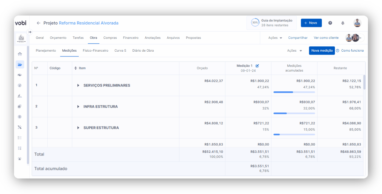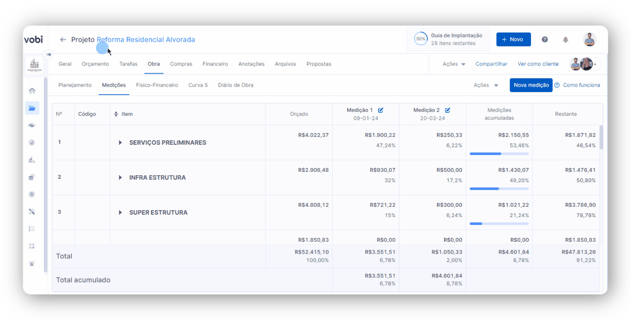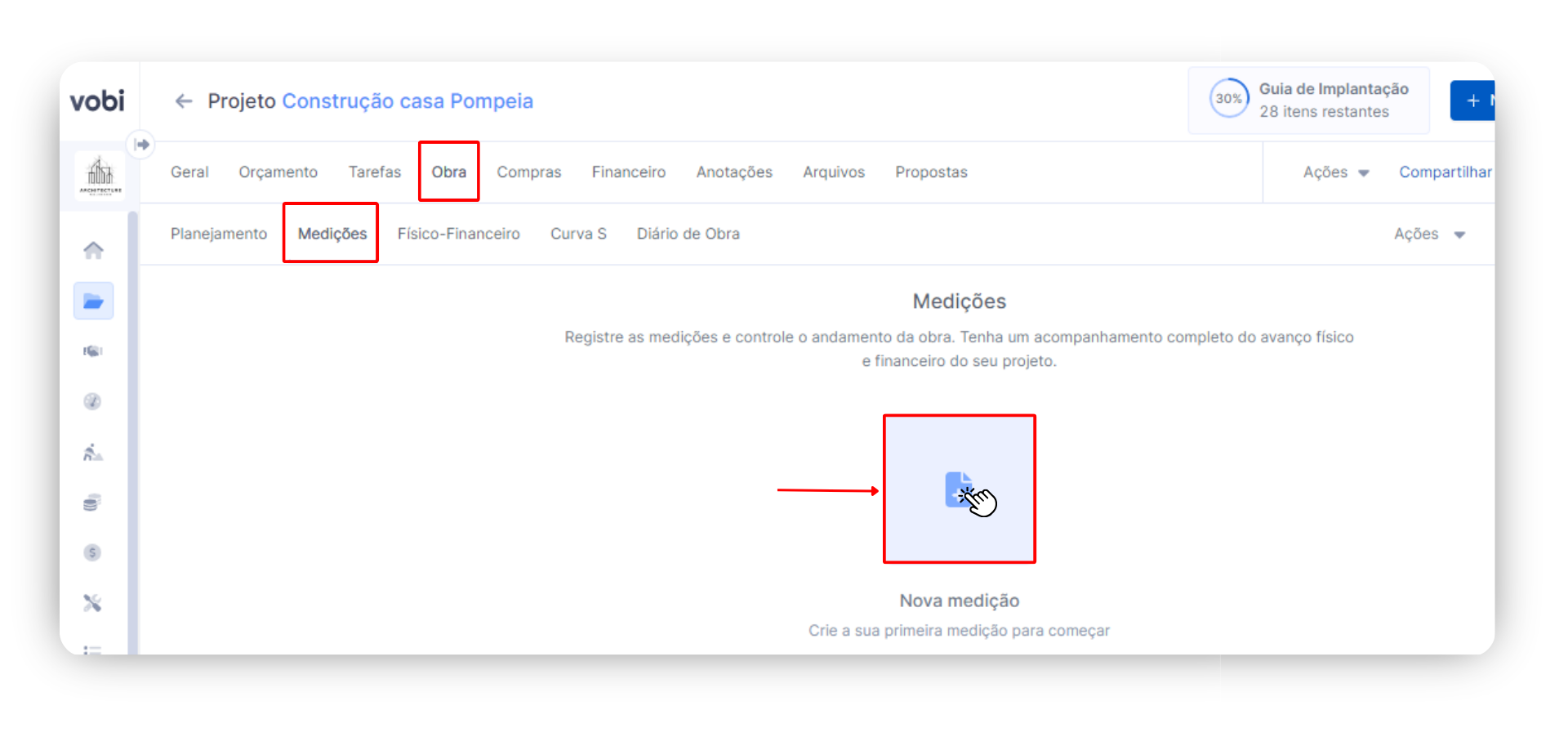 Por padrão, após ter criado um Orçamento na Vobi, na aba Obra você terá a opção de adicionar e acompanhar suas Medições.
