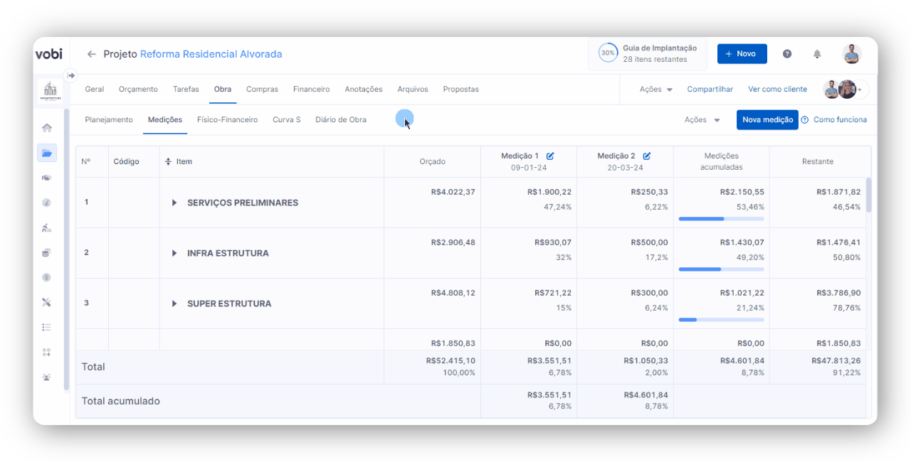 Depois de registrar suas medições, você poderá acompanhar o total acumulado até o momento. Compare com o que foi previamente orçado e visualize o que ainda tem restante para ser feito, além de conferir os totais. Veja o total por medição e o total acumulado para ter uma visão clara do andamento da obra!