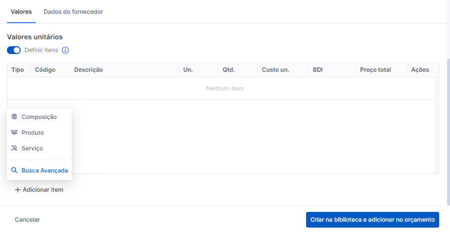 E para os casos de composições com os itens detalhados é só ativar o botão de Definir Itens e adicionar os itens necessários!
