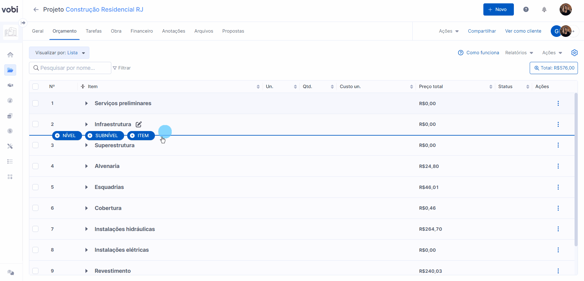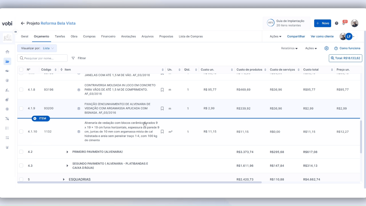 Uma vez que sua biblioteca tenha sido devidamente preenchida com produtos, serviços e composições você terá a praticidade de poder adicionar qualquer um desses itens à qualquer orçamento, agilizando o processo e otimizando seu tempo!