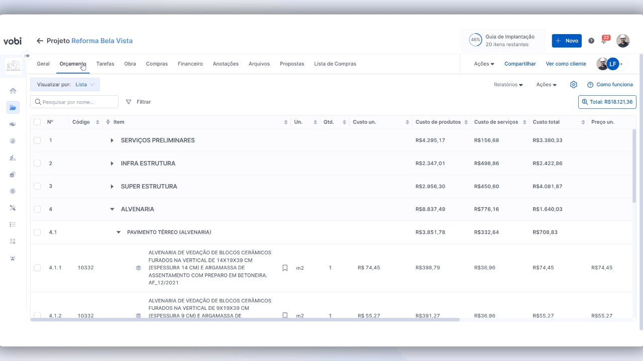 Visão assertiva no valor final da obra.