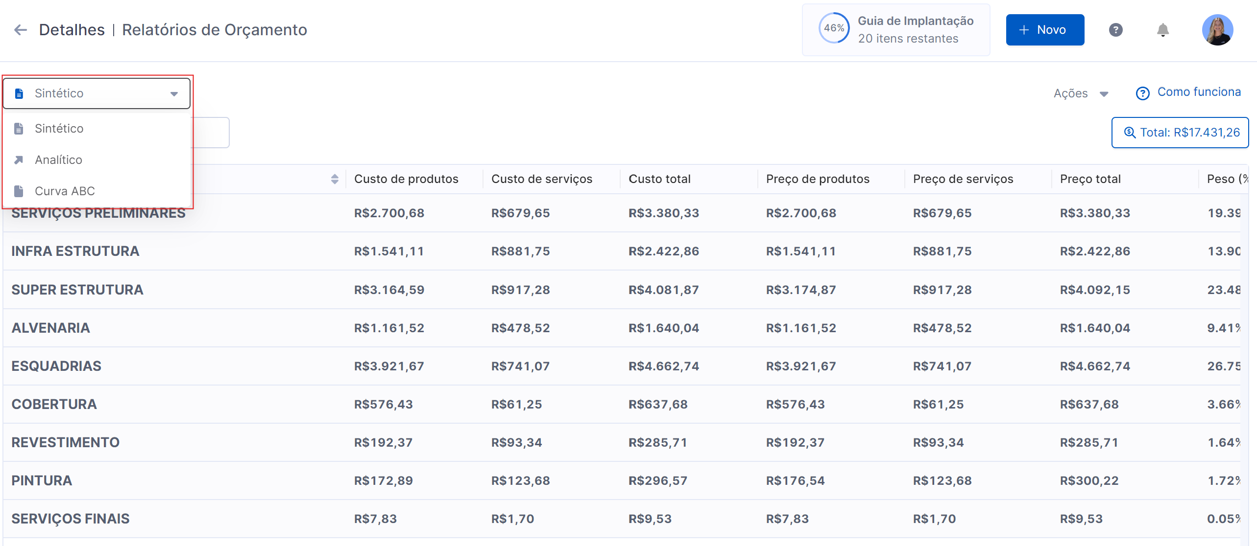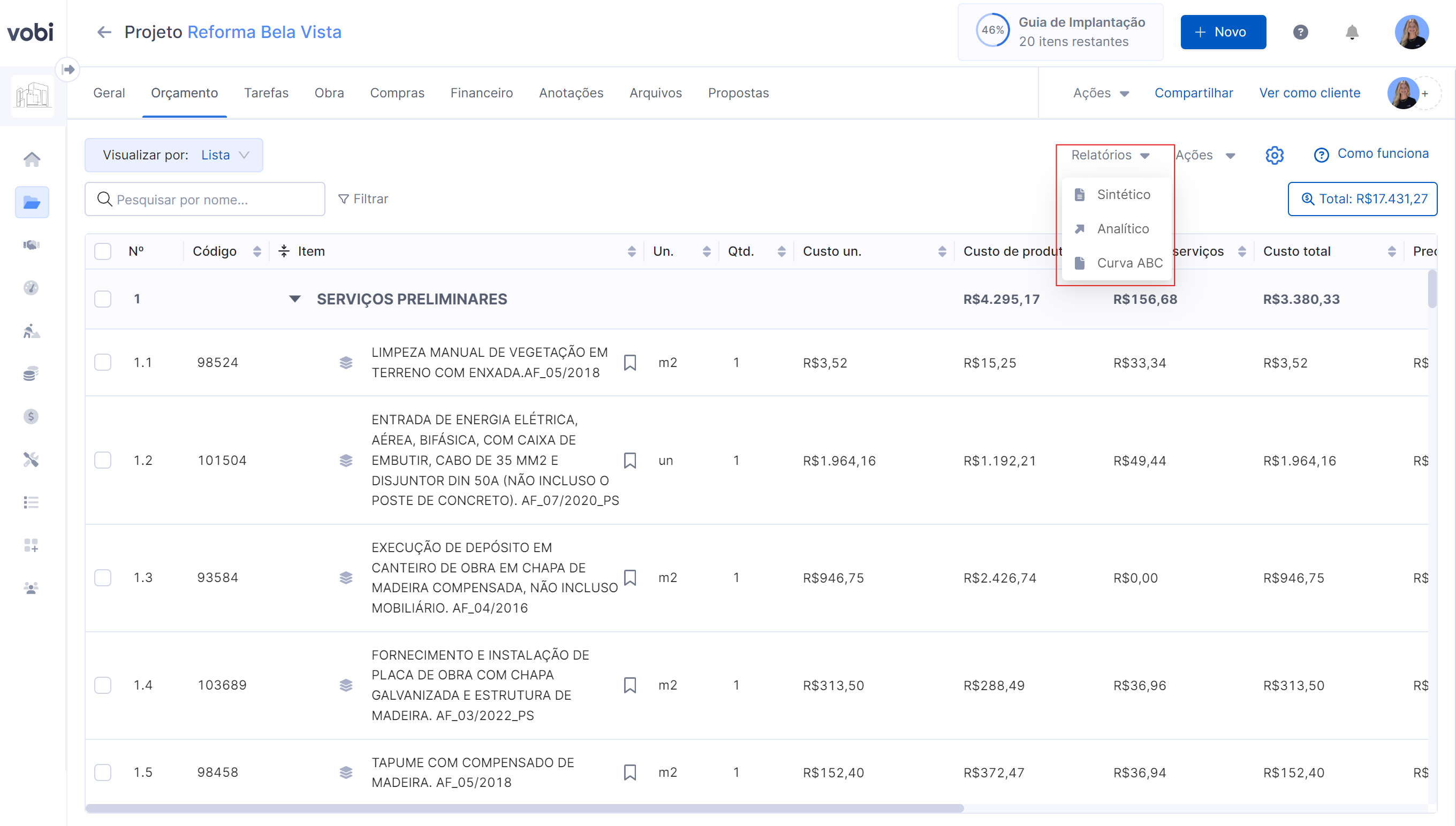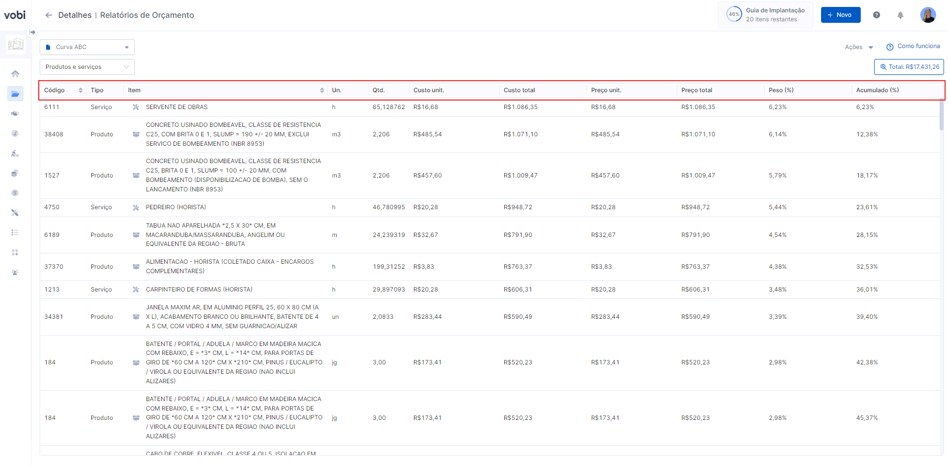 Após estruturar seu orçamento com todas as informações para cada produto e serviço, como por exemplo: quantidade, unidade, preço unitário e preço total, conseguimos ter a visualização do Relatório de curva ABC.