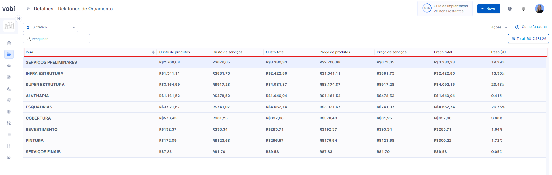 Sintético - nessa opção você terá somente a visualização dos níveis do seu orçamento, podendo analisar os valores com e sem BDI, somente dos produtos ou serviços e totais. Além disso também é possível analisar o peso de cada nível no orçamento.