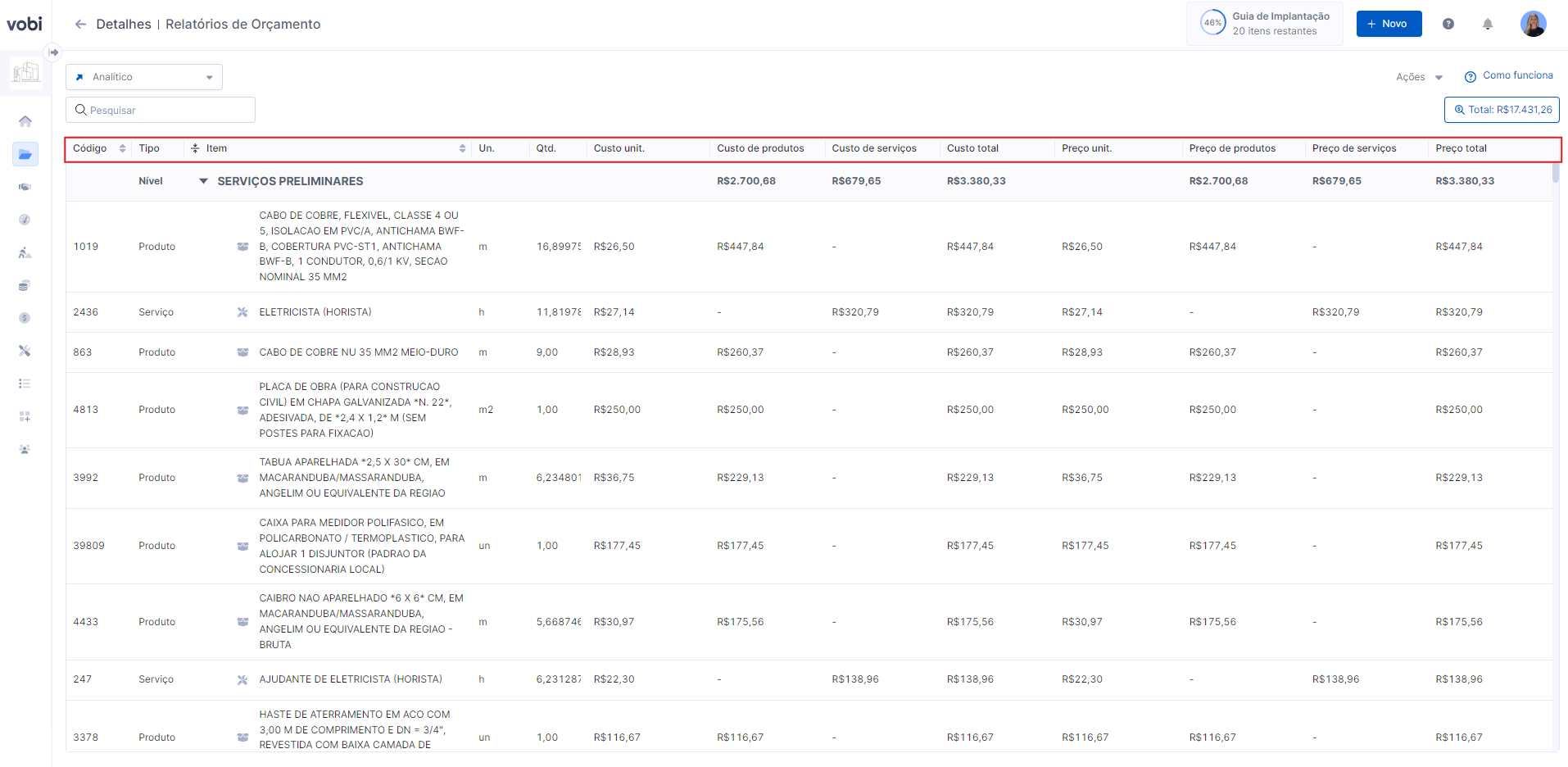 Com o relatório de orçamento analítico você conseguirá visualizar os todos os produtos e serviços existentes em cada nível do seu Orçamento.