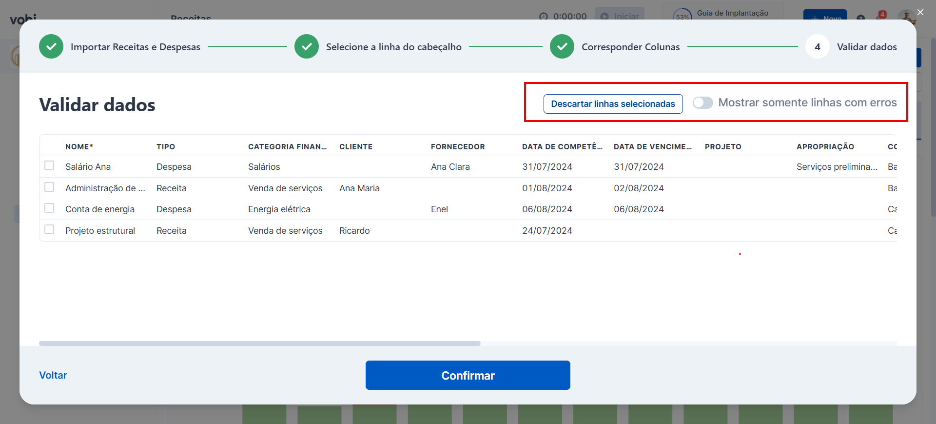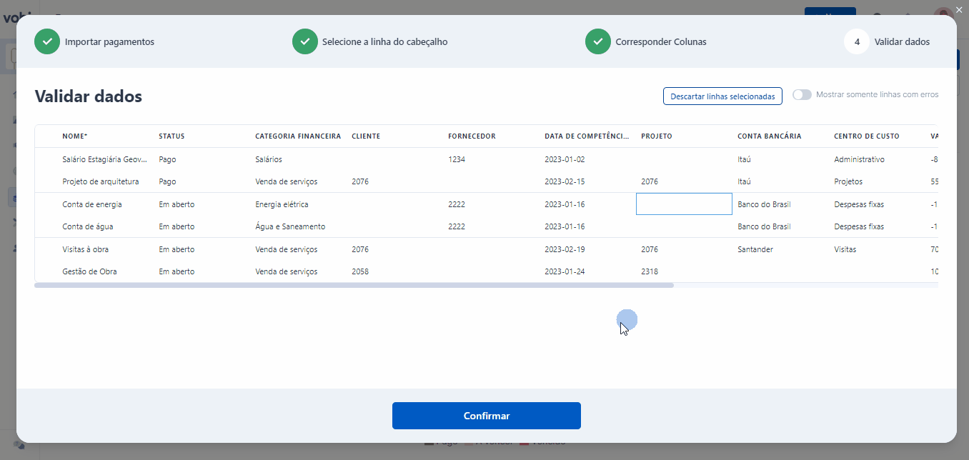 Na validação de dados, você identificará se algum erro aconteceu na sua planilha! Através de Mostrar somente linhas com erros, você visualiza somente o que tem erro e pode corrigir ou então descartar linhas selecionadas através do ícone acima. Após correção, clique em Confirmar.