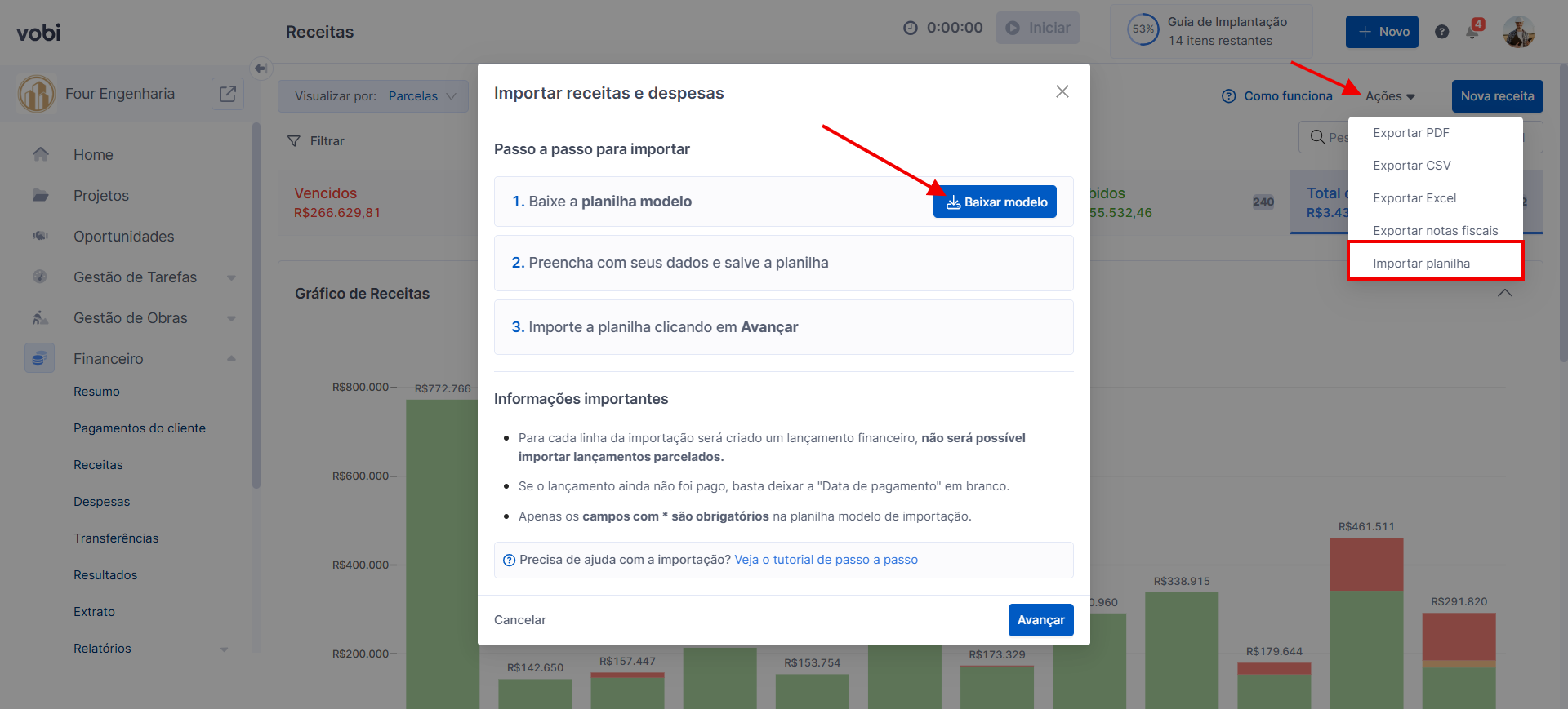 Ao selecionar a sub aba de Receitas ou Despesas, você verá o ícone de Ações. Clique em importar planilha, irá abrir uma caixa de diálogo com as orientações, clique no botão Modelo de importação para baixar a planilha modelo que disponibilizamos para você.