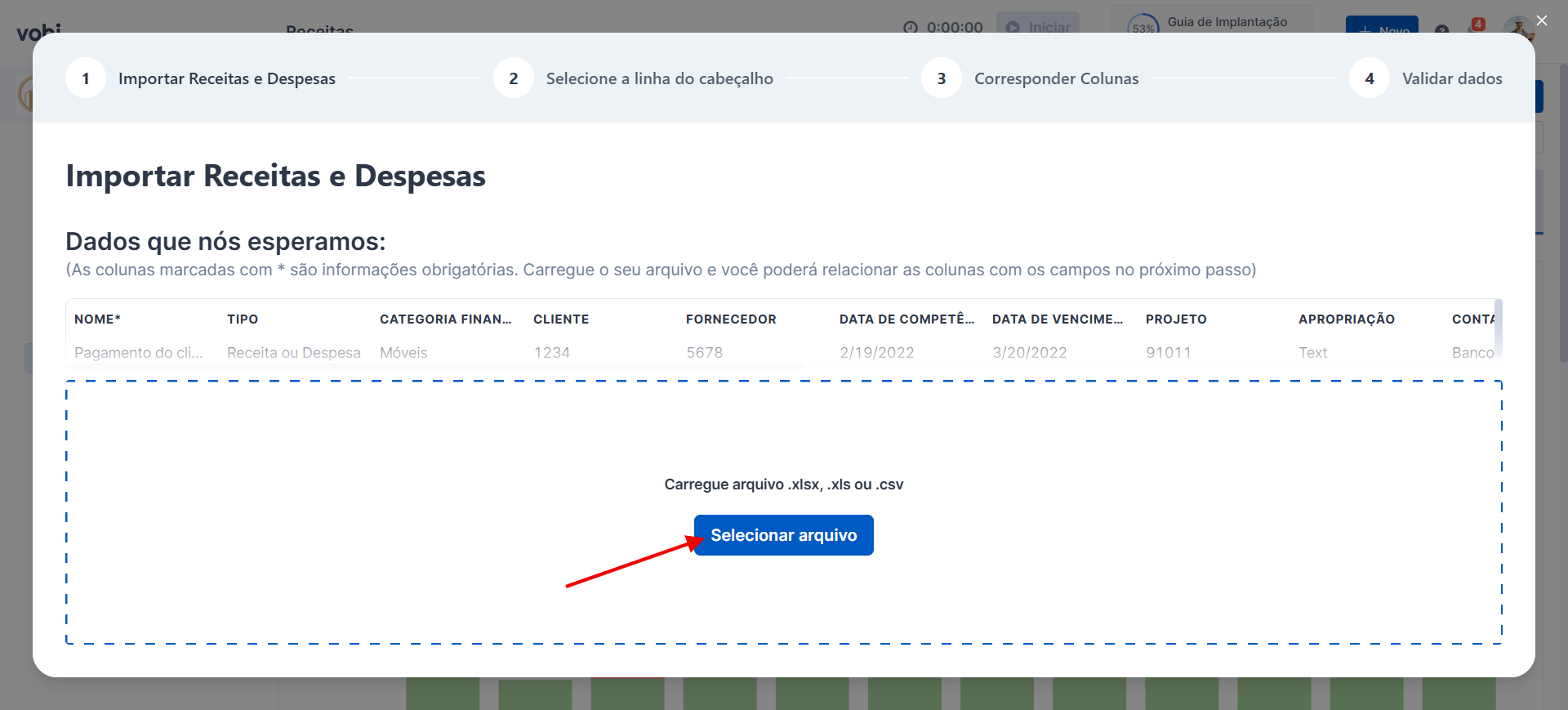 Projeto: aqui você poderá vincular ou não a receita/despesa a um projeto já existente na plataforma Vobi. Esse vínculo é feito através do preenchimento com o Nome cadastrado para esse projeto, precisa preenchido com o nome igual ao cadastrado na plataforma, caso nome informado não exista, dará erro na importação.