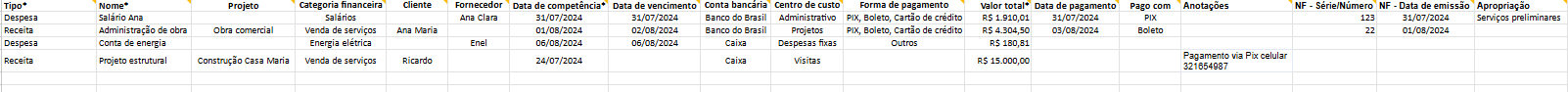 Abaixo temos um exemplo de planilha de importação de dados financeiros