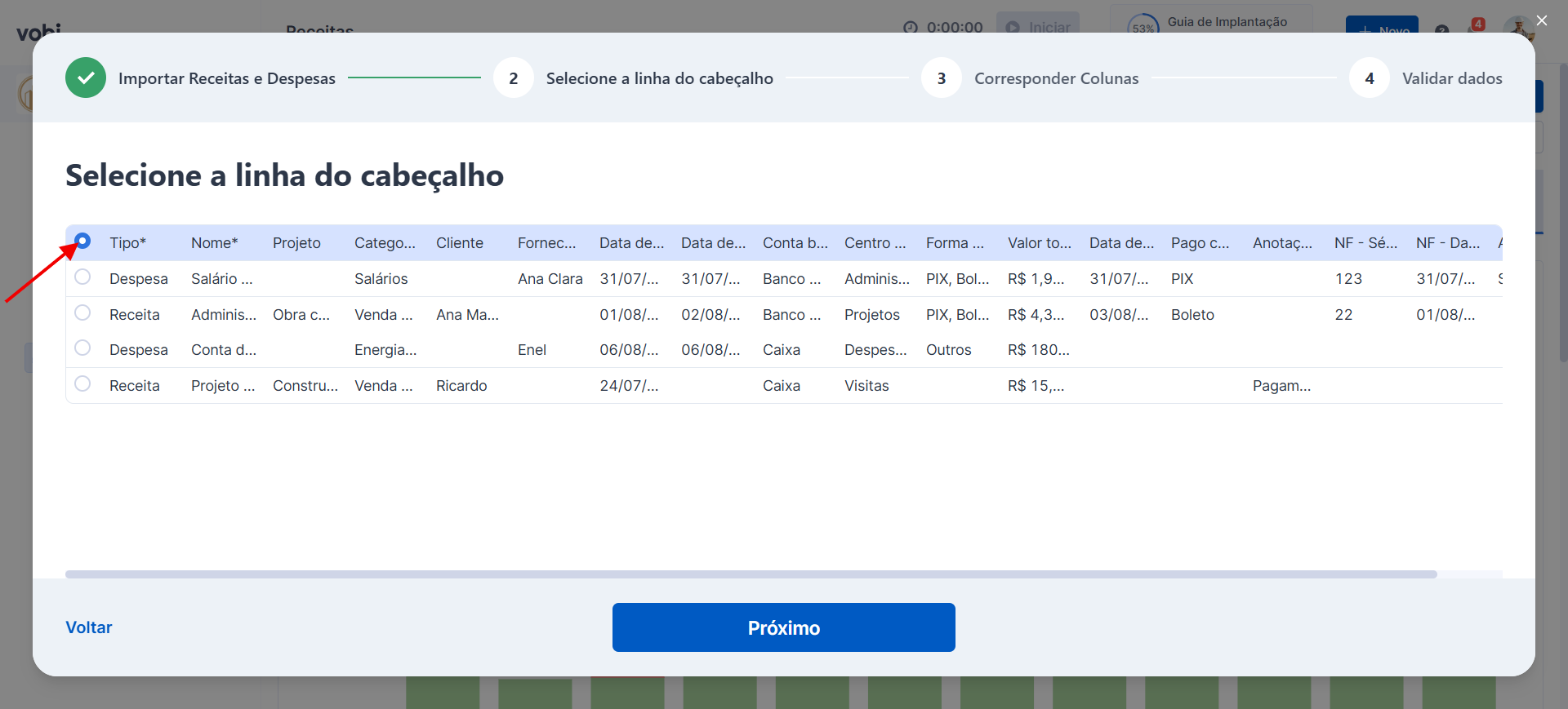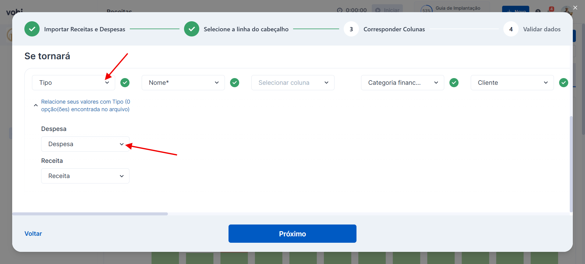 No próximo passo, o sistema vai identificar automaticamente as colunas relacionadas ao dado que está sendo importado, ou seja, você vai corresponder as colunas! Nesse passo é muito importante que você verifique o relacionamento de valores. Por exemplo: na coluna de Tipo, temos que relacionar Despesa com Despesa, Receita com Receita, como na foto abaixo