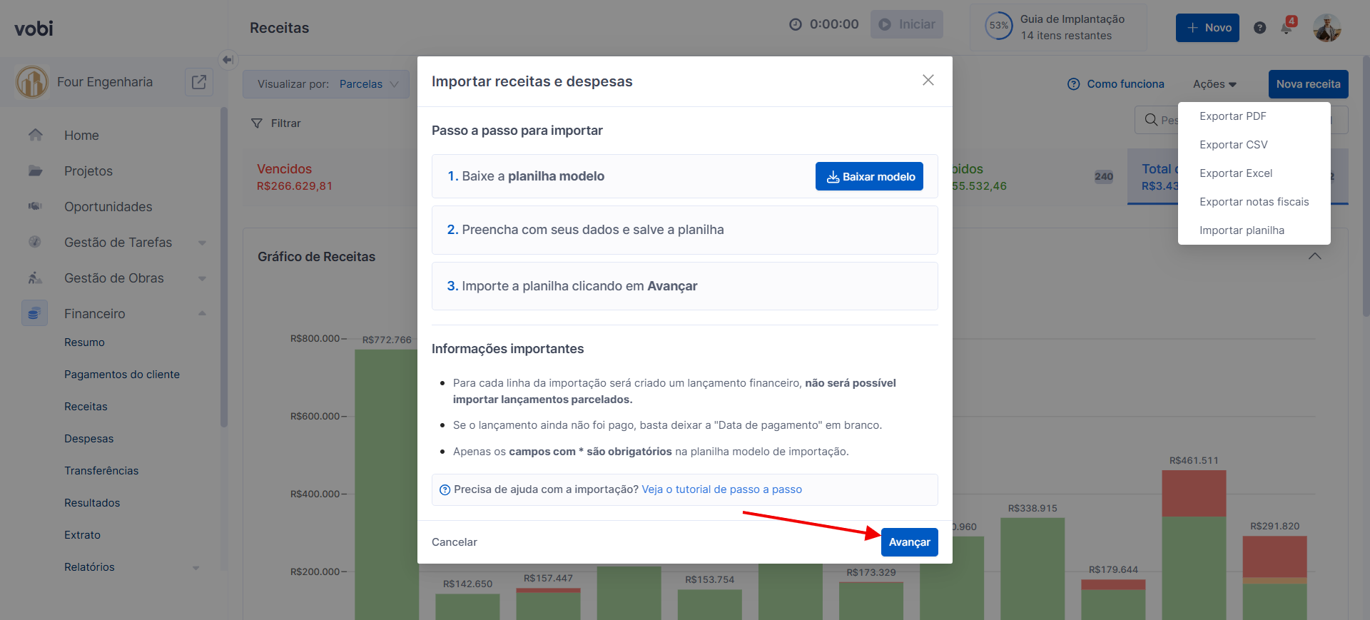 Após preencher a planilha e salvar, você deve voltar no Financeiro da plataforma, na caixa de diálogo é só clicar em Avançar!
