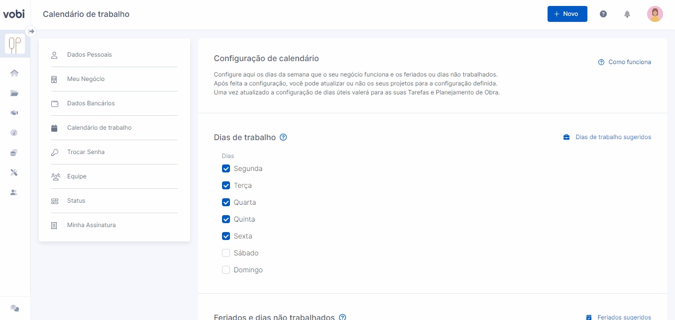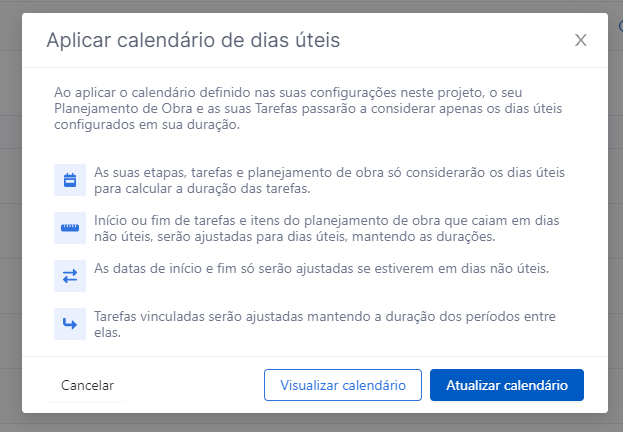 Com o calendário de trabalho, você pode estruturar quais são os dias úteis de acordo com a sua empresa e aplicar isso de forma automática nos seus projetos e obras! Agora ficou ainda mais rápido fazer planejamentos assertivos!