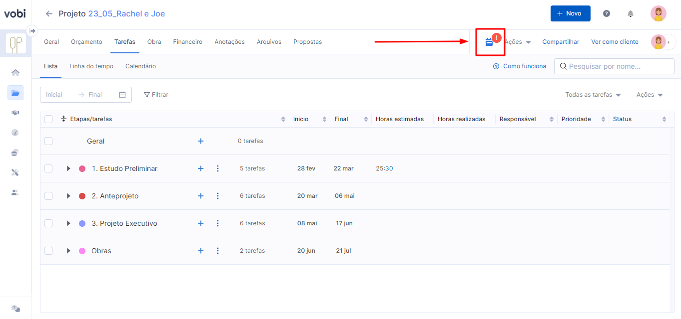 Após você estruturar o calendário da sua empresa, você pode compatibilizar os projetos que já possuem um cronograma ou planejamento estruturado em apenas um clique! Ao acessar a página de cada projeto, você verá um ícone de calendário na parte superior e ao clicar no ícone, o cronograma configurado será aplicado naquele projeto, atualizando as datas das suas tarefas.