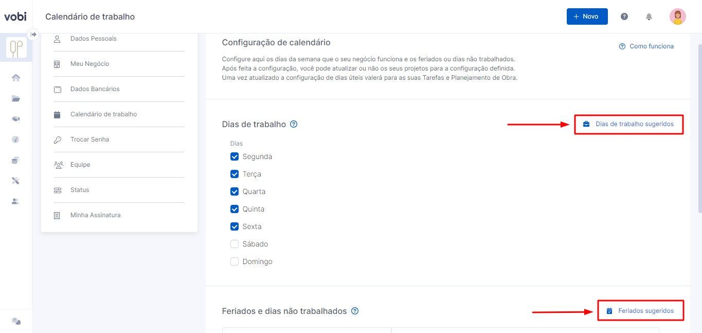 A configuração do seu calendário se baseia em três variáveis: dias úteis, feriados e recessos. Começando pelos dias de trabalho, você selecionará os dias úteis da sua empresa! Já em feriados e dias não trabalhados, você poderá adicionar os feriados e seus respectivos recessos, da forma que atenda melhor o seu negócio!