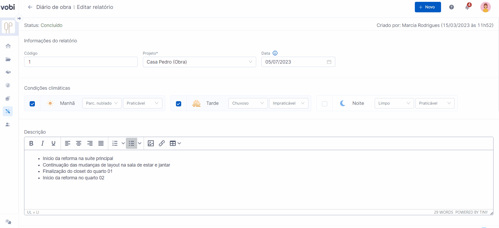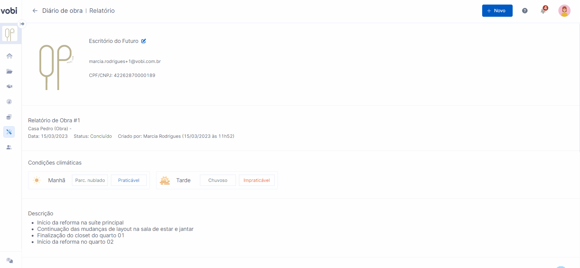 Com as novas atualizações da Vobi, você pode realizar relatórios de obra bem mais completos, em um só lugar, e ainda enviar pdfs mais profissionais para o seu cliente ficar ciente de tudo que aconteceu no dia da obra.