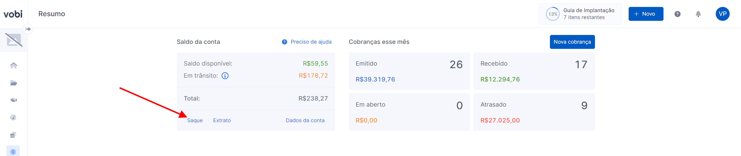 Para realizar a transferências de valores da sua conta da Vobi Pay para outra conta basta acessar o menu lateral em Vobi Pay ➝ Resumo.