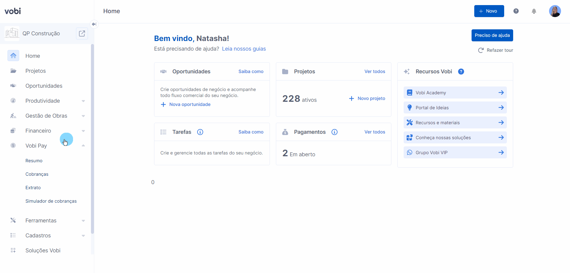 Para começar, acesse a sua conta na plataforma Vobi e através do menu lateral acesse Vobi Pay ➝ Resumo.