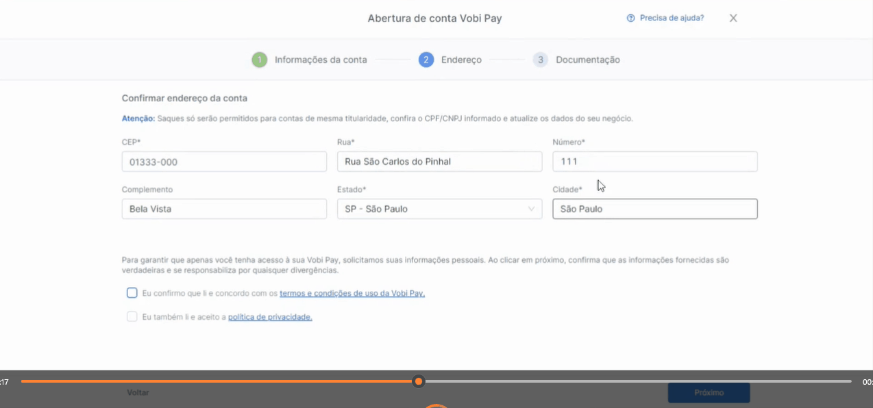 Importante: se atente no momento de preencher o CPF ou CNPJ para o cadastro na Vobi Pay, visto que depois da aprovação da conta, não será possível alterar esse dado. Além disso, lembre-se de que os saques só serão autorizados para contas com a mesma titularidade. Portanto, assegure-se de possuir outra conta associada ao mesmo CPF ou CNPJ.