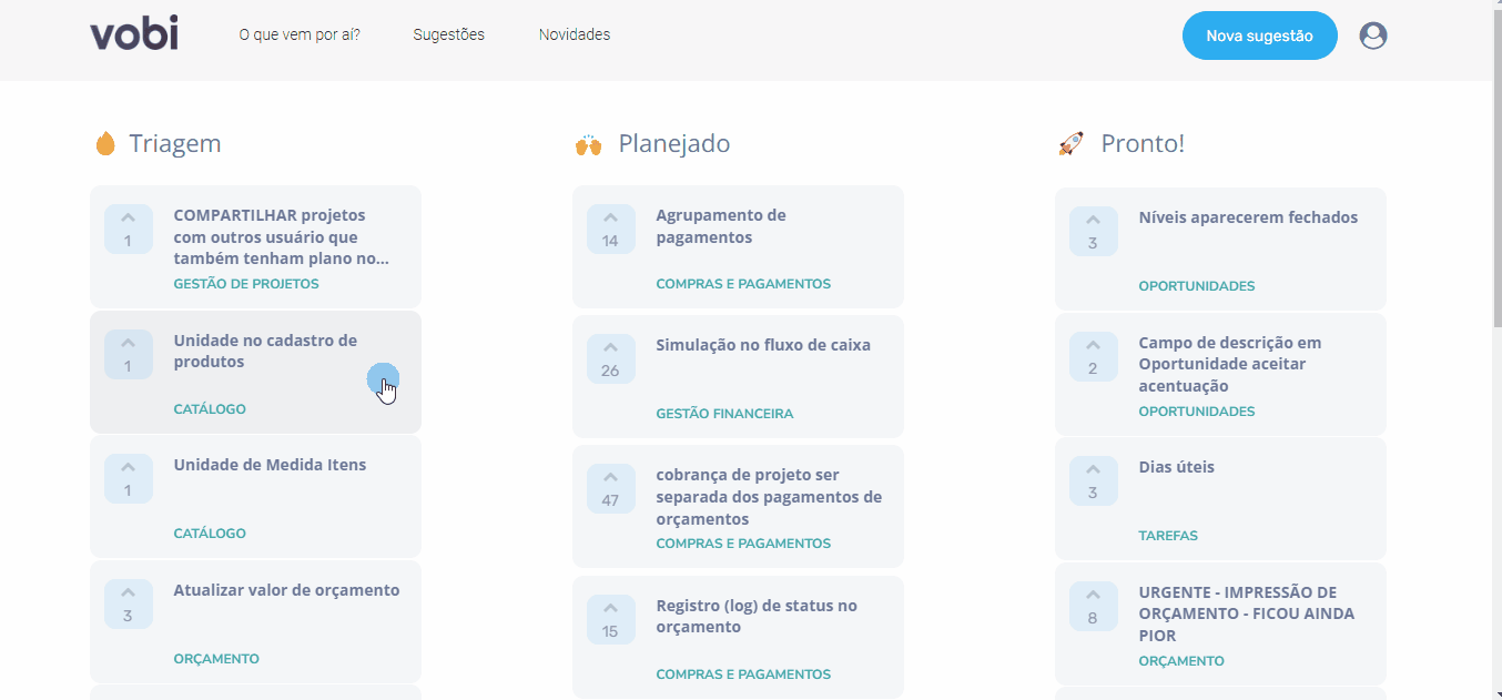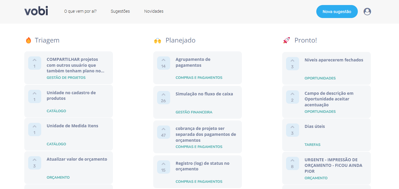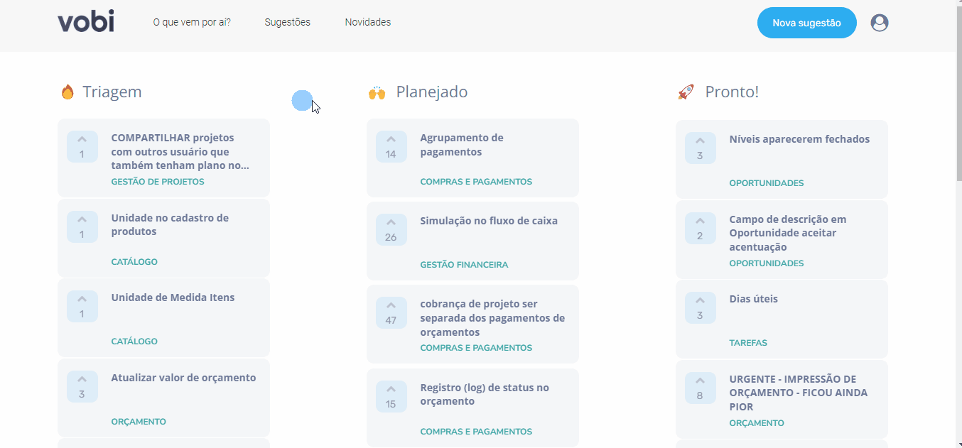 Apesar das ideias com mais votos pesarem mais na análise, nós priorizamos as sugestões de acordo com o impacto no dia-a-dia do usuário e também a viabilidade técnica, além do planejamento estratégico de crescimento da Vobi. Portanto, não podemos afirmar que sempre as ideias mais votadas serão as primeiras aprovadas e passadas para desenvolvimento.