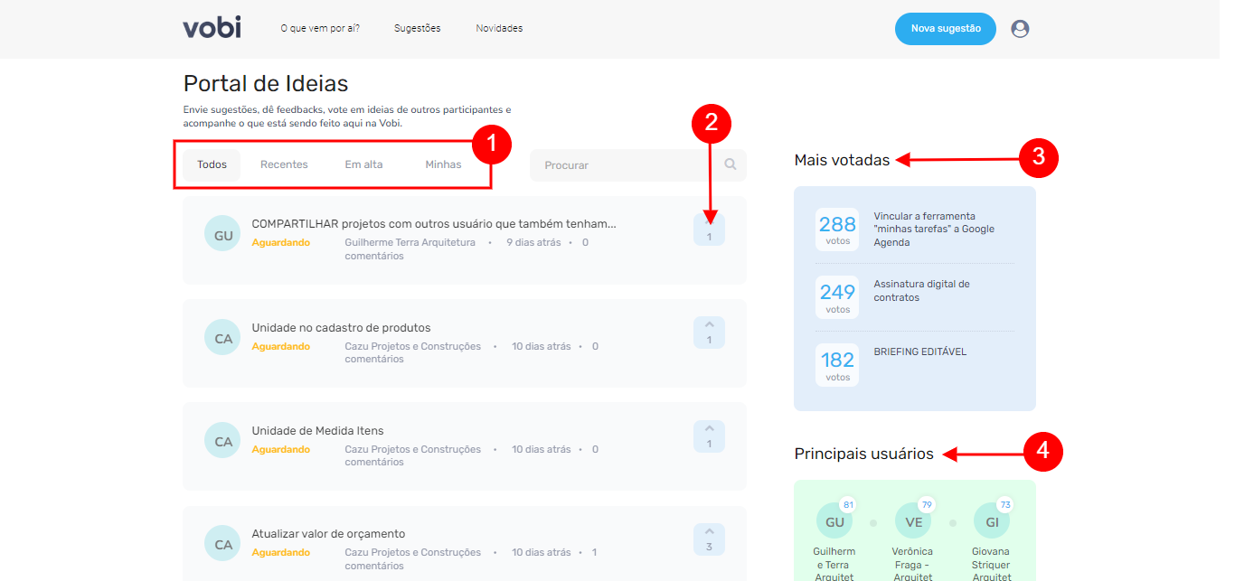 No canto direito da tela de Sugestões, você encontrará as três ideias mais votadas atualmente (3), além dos três usuários (4) que mais compartilham suas ideias no nosso Portal!