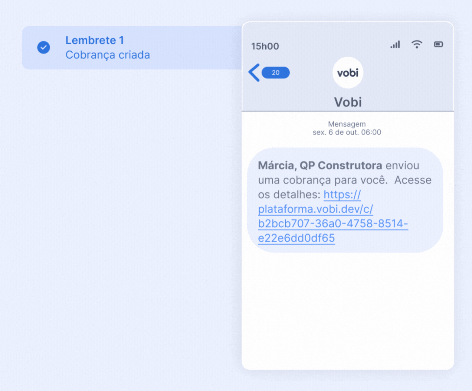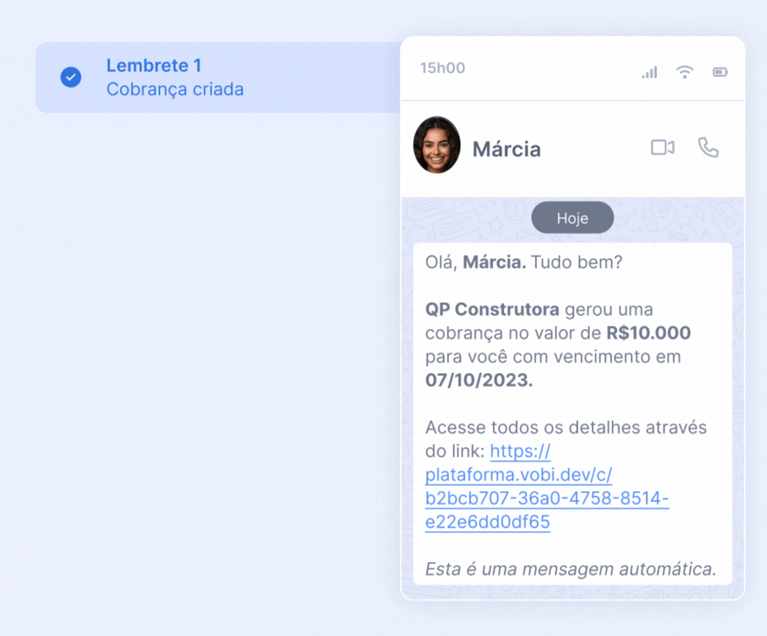 Atualmente a Vobi Pay oferece seis momentos em que os lembretes de cobrança podem ser enviadas ao seu cliente através de E-mail, SMS ou WhatsApp.