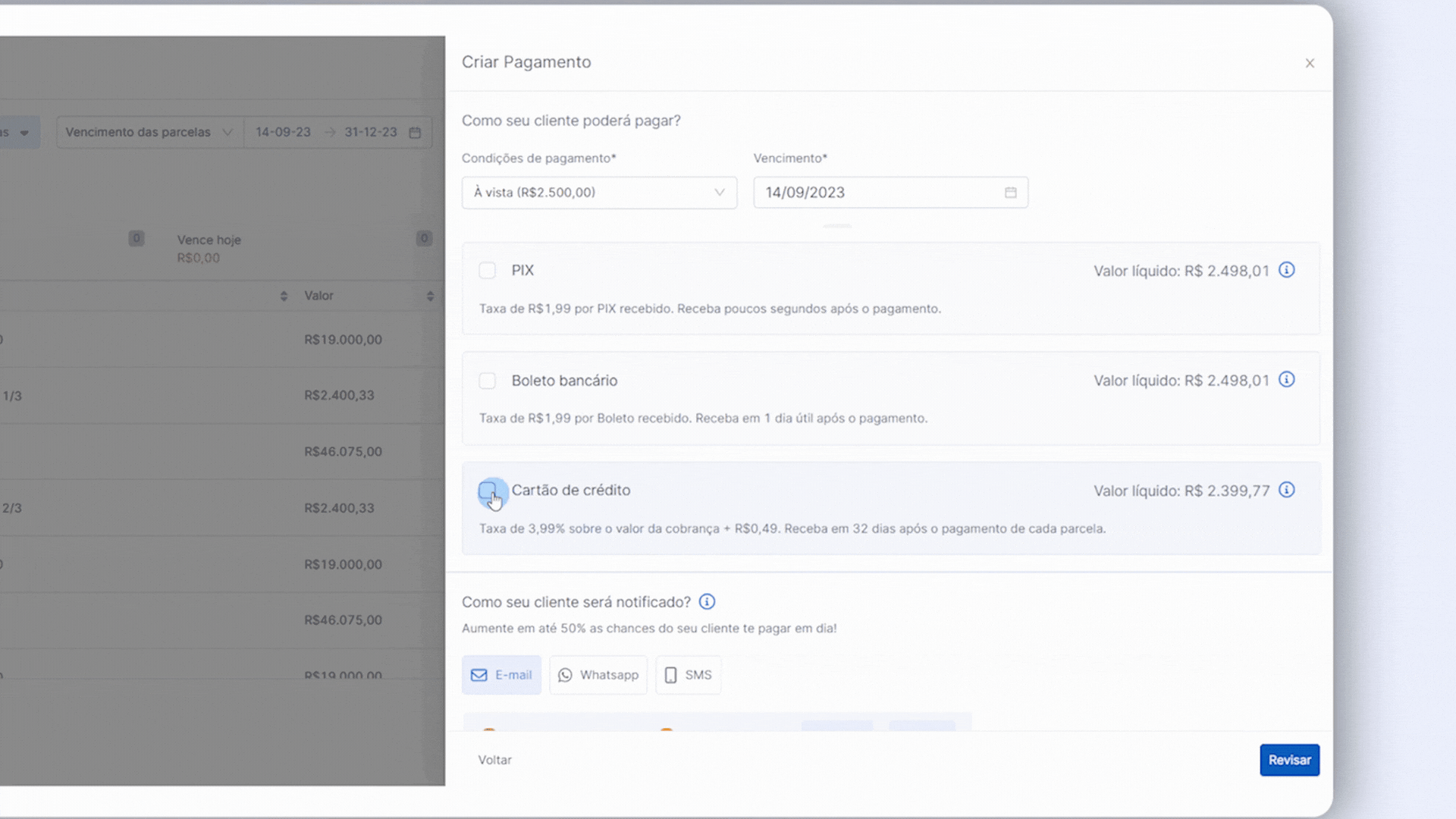 2. Além disso, os primeiros 15 créditos para envios de notificações automáticas via WhatsApp e SMS são por nossa conta! Basta criar a cobrança e selecionar por onde deseja notificar o seu cliente.