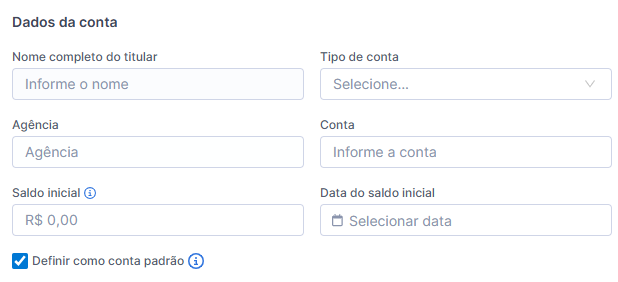 Definir como conta padrão: Ao definir como padrão, essa conta será selecionada automaticamente no cadastro de novos lançamentos financeiros.