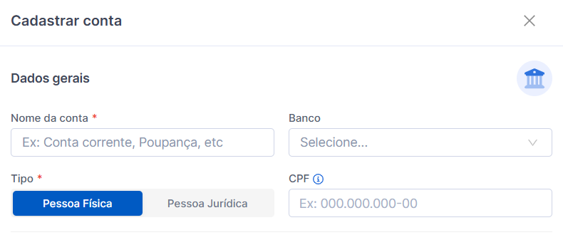 Nome da conta: Insira o nome da conta bancária (por exemplo, Banco do Brasil, Nubank, etc.). Dentre todos os campos, o de descrição é o único em que é obrigatório o preenchimento.