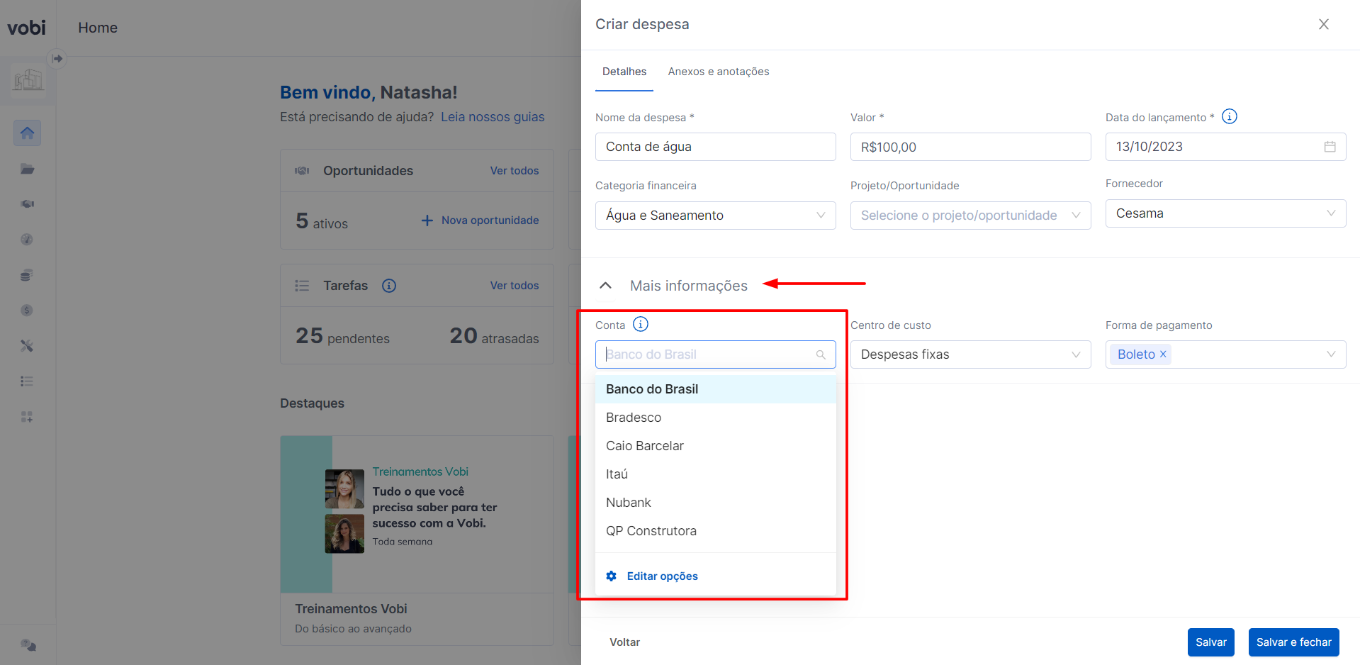 E confirmar! Agora que você cadastrou sua conta bancária, basta selecioná-la ao criar um novo lançamento financeiro no campo Conta.