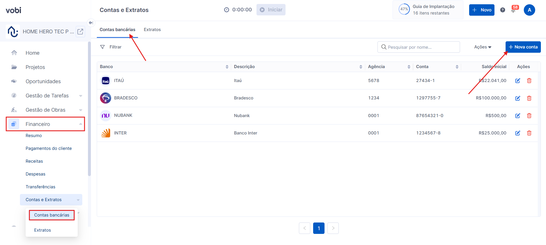 Dica da Vobi: recomendamos que você, inicialmente, acesse o módulo de Cadastros e registre todas as contas bancárias usadas em seu negócio com o saldo inicial correspondente a data de início de utilização da Vobi. Depois disso, conforme for necessário, você pode adicionar novas contas bancárias rapidamente diretamente de um lançamento financeiro.