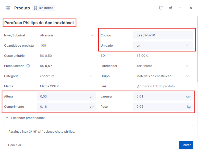 As informações do produto são padronizadas na biblioteca. O maior benefício é que qualquer mudança nesses campos de informações retratados acima se reflete automaticamente em todos os outros "Parafusos Phillips de Aço Inoxidável" em todos os projetos e orçamentos. Isso elimina a necessidade de ajustes manuais repetitivos, economizando um tempo valioso e mantendo a consistência.