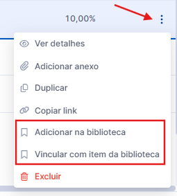 3° opção: Criar um item no orçamento e Adicionar na biblioteca pelos 3 pontinhos desse item, assim você salva esse item na sua biblioteca para utilizar em outros projetos, e a partir do momento que você faz essa ação esse item se tornará um item vinculado á biblioteca.