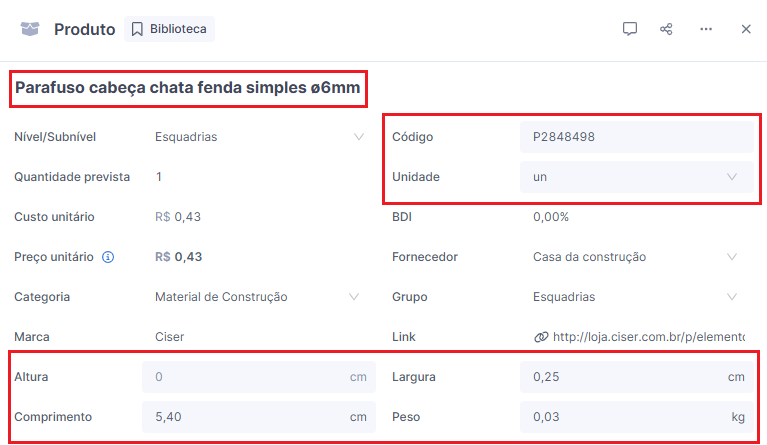 Esses campos possuem dados unificados que podem ser modificados através da Biblioteca. Essa padronização tem implicações importantes, já que qualquer alteração nesses campos de informação afetará todos os seus orçamentos que possuem esse item vinculado.