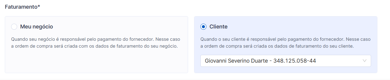 Meu negócio: quando seu negócio é responsável pelo pagamento do fornecedor. Nesse caso a ordem de compra será criada com os dados de faturamento do seu negócio e o fornecedor poderá acessá-los para emitir a nota fiscal com os devidos dados.