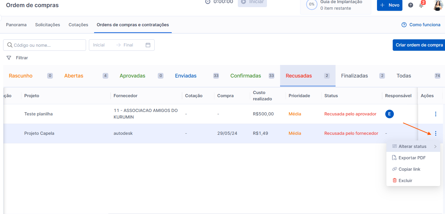 Agora, quando a Ordem de Compra é marcada como recusada pelo fornecedor ou pelo aprovador, ela vai para o status de Recusada, permitindo que você faça os ajustes necessários ou encontre uma solução alternativa para garantir a continuidade do processo de compra. Após esses ajustes e o próximo envio, você poderá clicar no ícone de três pontos > Alterar Status> Voltar para enviada (recusadas pelo fornecedor) ou Voltar para Aberta (recusadas pelo aprovador).