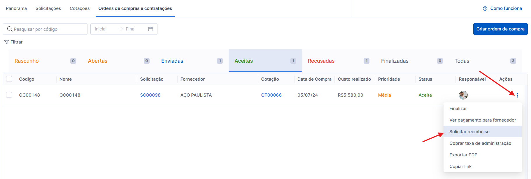 Depois, ela poderá encontrar essa Ordem de Compra no status de Aceita. Ao selecioná-la ou clicar no ícone de três pontos ⫶ ao lado dela, o profissional poderá clicar em Solicitar reembolso do seu cliente.