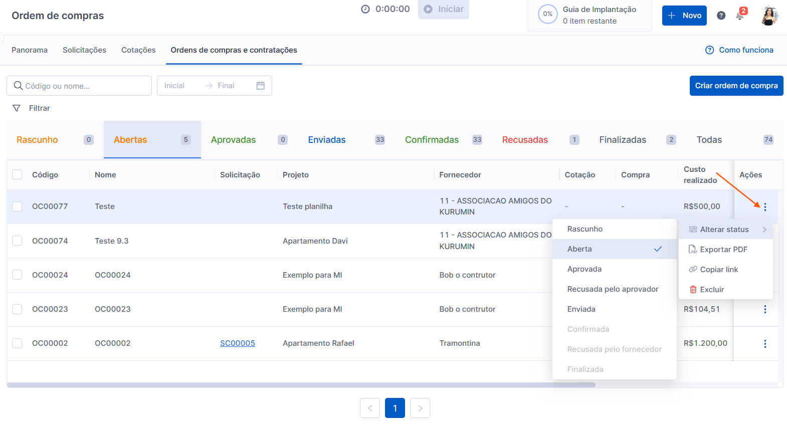 Para mudar o status de uma ordem de compras, é bem simples! Basta clicar nos ícone de três pontos ⫶ no canto direito e logo após em Alterar Status e escolher o próximo status!